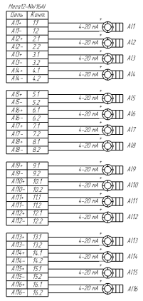 Схема подключения аналоговых датчиков с выходным сигналом 0-20 (4-20) мА к модулю Мега12-NW16AI показана на рисунке 2.9.4