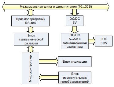Модуль предназначен для ввода аналоговых сигналов от датчиков, имеющих унифицированный токовый выход «4-20мА» и передачи данных по цифровой последовательной шине данных в управляющий контроллер. Модуль оснащен светодиодными индикаторами состояния каналов. Измерительные каналы имеют гальваническую развязку от общей шины контроллера