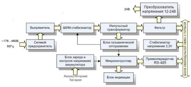 Модуль обеспечивает питание контроллера с модулями ввода-вывода, подключаемых к ним датчиков и выполняет следующие функции: