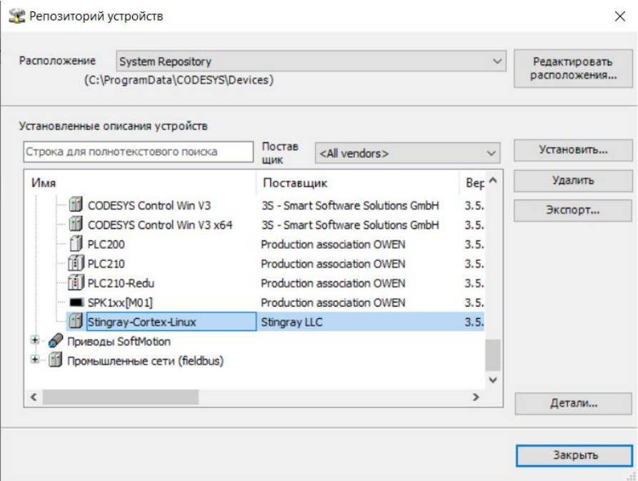 После установки и запуска среды программирования контроллеров CoDeSys в репозиторий устройств необходимо добавить ПЛК из файла Stingray-Cortex-Linux.devdesc.xml. Для этого в окне репозитория устройств (Рисунок 3.7.1) нажмите клавишу «Установить» и установите фильтр типа файлов «Файлы описания устройств (*.devdesc.xml)» и выберите файл 4096_16fc 0001_3.5.12.46.devdesc.xml и нажмите клавишу «Открыть», после чего ПЛК Stingray-Cortex-Linux отобразится в репозитории устройств. Далее создайте новый пустой проект, в который добавьте устройство ПЛК Stingray-Cortex-Linux.