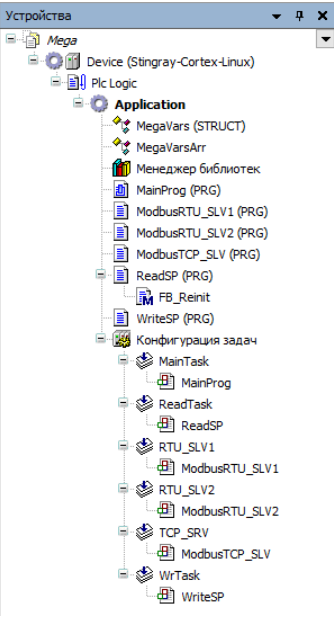 Прежде чем создавать собственный программный проект в CoDeSys рекомендуется запустить в контроллере демо проект Mega.project и ознакомится с его основными функциями. Структура проекта представдена на рисунке 3.7.3. Данный проект содержит следующие программы: