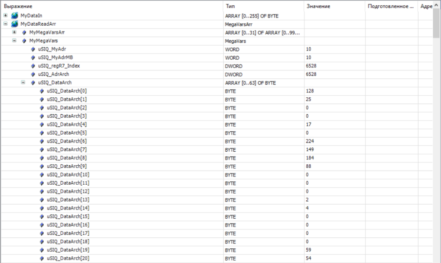 Проект содержим в своём составе структуру данных MegaVars, которая входит в объединение MegaVarsArr. Данные этой структуры доступны для чтения по протоколам Modbus RTU/TCP и РТМ64Var. С Modbus адреса 500 структура содержит данные читаемые из контроллера Мега12. С Modbus адреса 8000 структура содержит данные заполняемые пользователем. Первые 1000 байт данных пользователя и адреса контроллера РТМ и Modbus (uSIQ_MyAdr, uSIQ_MyAdrMB) сохраняются в виде переменной Retain и восстанавливаются после перезагрузки контроллера. Поэтому, в данную область можно писать уставки программных алгоритмов. Сохранение данных производится раз в 10 минут и может быть измененно в программе ReadSP в таймере RetainTON(IN:=TRUE, PT:=T#600S). Функция сохранения переменных реализуется с помощью ФБ RetainManager, которая выполняет сохранение Retain переменных в файл. Всего доступно для сохранения 4096 байт данных.