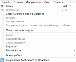 - загрузка исходного кода: Загружает весь проект на устройство. Это позволяет впоследствии считать проект с контроллера в CoDeSys для дальнейшей разработки и отладки;