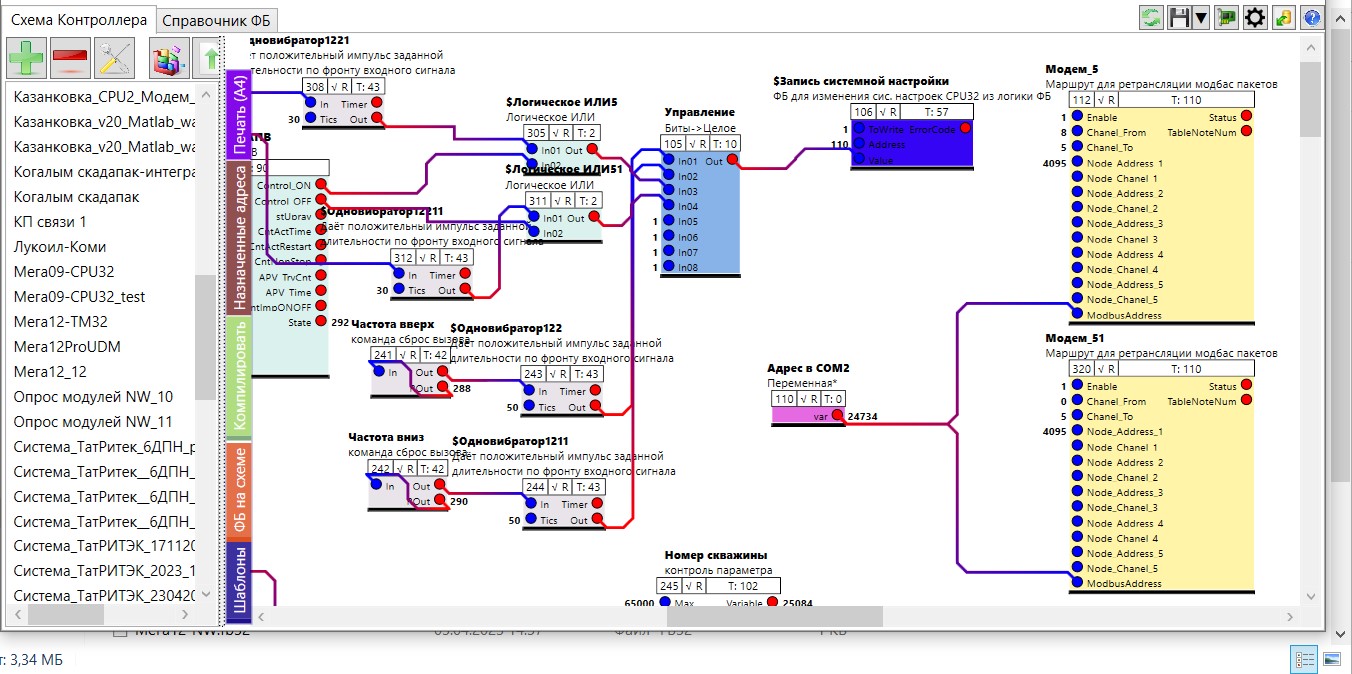 Функциональные блоки в конфигураторе ФБ32 пользователь не может создавать самостоятельно, но для описания алгоритмов управления в контроллере Мега12-NW имеется более 100 готовых алгоритмов функциональных блоков, включающих в себя логические и арифметические блоки, блоки преобразования типов данных и работы с массивами, блоки работы с интерфейсами и протоколами, блоки работы с часами реального времени, архивирования данных и целые алгоритмы управления, например, ГЗУ, задвижка или ПИД-регулятор.