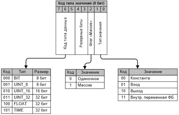 Каждый вход/выход/переменная ФБ описывается с помощью кода типа значения, а также служебных полей (начальный адрес в массиве общего назначения, кол-во элементов массива и т.п.), набор и порядок следования которых зависит от типа значения.