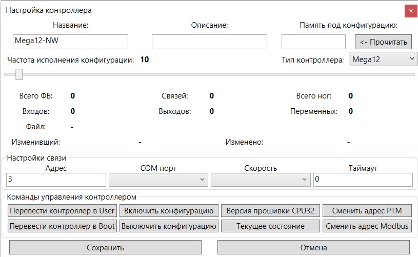 «Добавить новый контроллер» и в открывшемся окне введите «Название» и выберете «Тип контроллера» Мега12. Также установите желаемую частоту исполнения конфигурации. Если предполагается создание сложной конфигурации рекомендуется сделать исполнение реже. На рисунке 2 показано окно настройки контроллера