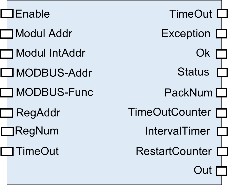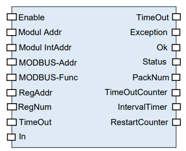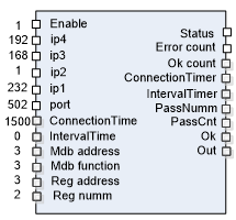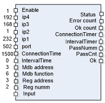 ФБ осуществляет чтение по mdbtcp протоколу с указанного IP4 – IP1 адреса с периодичностью «In-tervalTime»(мс.), тайм аут на соединение указывается в переменной «ConnectionTime». Если устройство не отвечает то ФБ начинает опрашивать реже до 25 «Intervaltime».