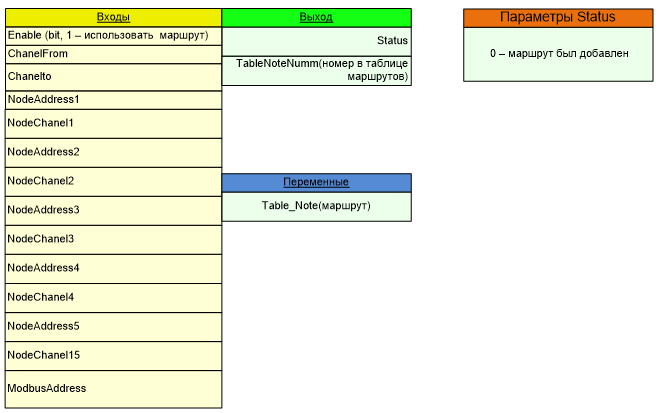 ФБ №110 настраивает в PacketManager маршрутизацию Modbus пакетов. Функциональный блок записыва-ет новый RTM маршрут для указанного Modbus адреса, в дальнейшем приходящий пакет разбирается и если он не совпадает с собственным адресом Modbus, но совпадает с адресом указанным в ФБ на входе ModbusAddress формируется пакет RTM_MW куда вкладывается Modbus пакет, при достижении пакета последнего адресата(последнее ненулевое значение NodeAddress) если Modbus адрес вложенный в пакет не совпал со своим то контроллер распаковывает Modbus и отправляет в канал указанный в NodeChanel.