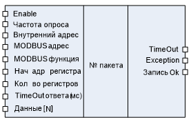 Отличается от ФБ №34 «MODBUS RTU Master new: Запись – функции 5/6/15/16» добавлением дополнительных выходов: