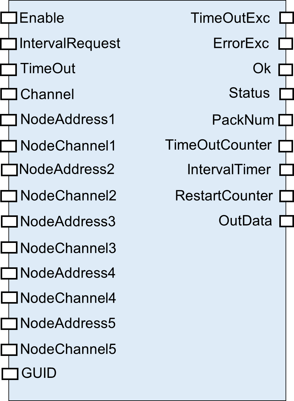 - Выход «Exception» - строго bit. Информирует об ошибке в процессе обмена данными, неверные данные или ответ за время таймаута не пришел. Выход Триггерный.