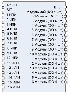 ФБ при последовательном соединении накапливает состояние DO так, чтобы при записи значения DO на одном этапе работы логики не затерло состояние DO установленное на предыдущем шаге. Для этого выход Модуль мой (DO 4 шт.) надо соединить со входом 1 ИЛИ и так далее.