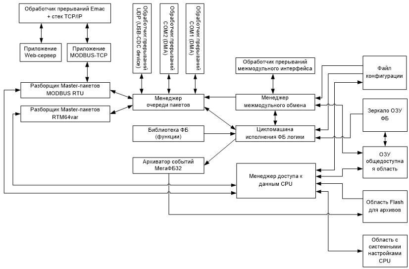 Когда приходит пакет с инструкцией на запуск конфигурации ФБ, менеджер пакетов/менеджер межмодульного обмена запускает цикломашину исполнения ФБ, которая будет исполнять логику ФБ, отправляет данные в менеджер пакетов/менеджер межмодульного обмена где формируются запросы устройств на портах и шине и записываться в очередь на отправку запросов в режиме «Мастер», и при получении ответа от «Ведомого» по прерыванию записываются в буфер канала, после чего разбираются в разборщике и обрабатываться процессором и отправляться в ОЗУ и flash для архивов.